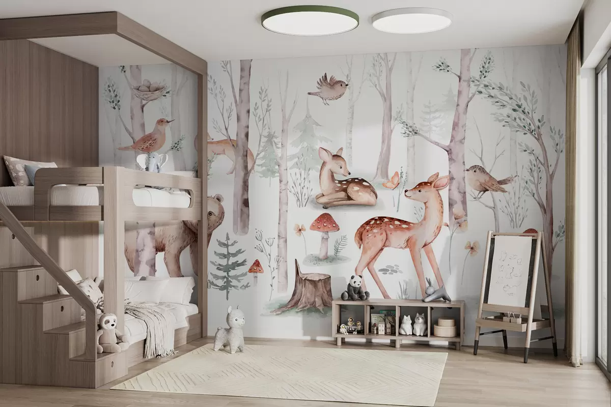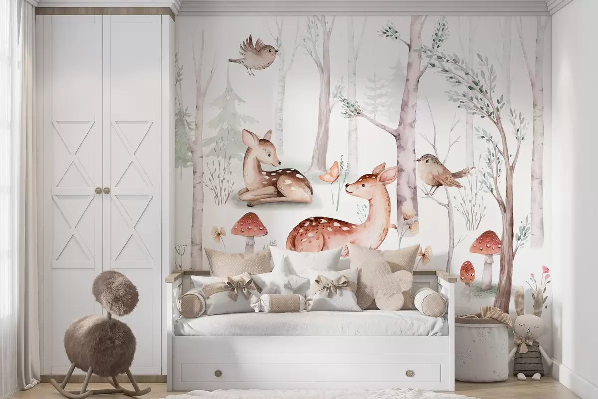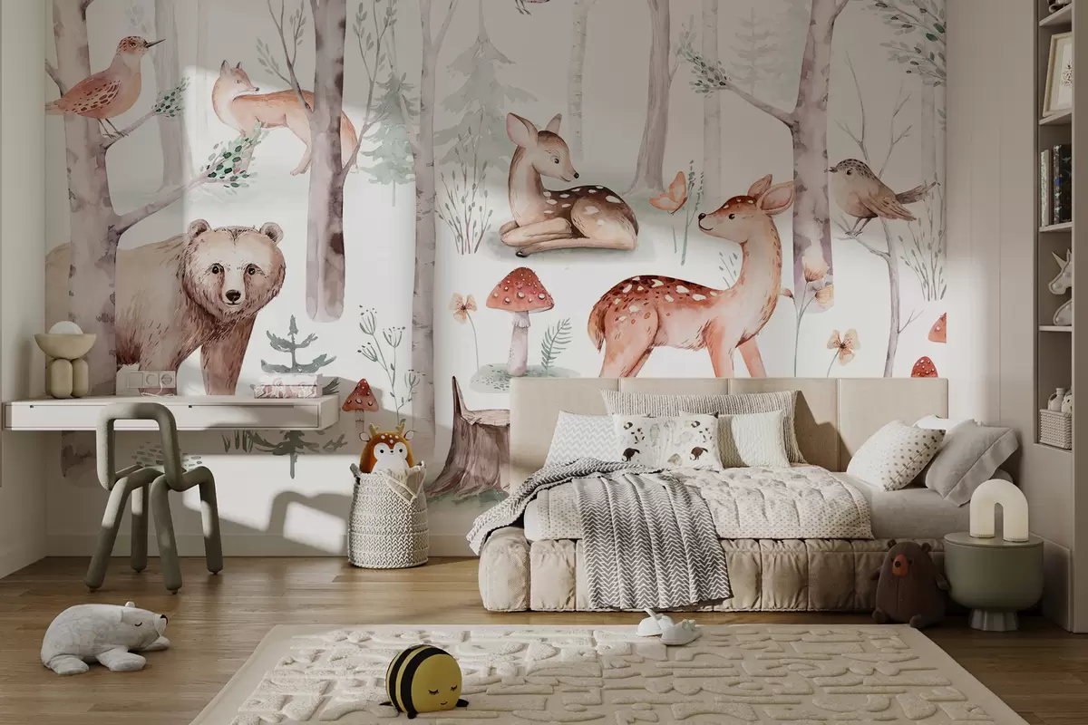 Fototapetak Tapéta a gyerekszobába, erdei állatok. Finom akvarell stílusú tapéta kellemes meleg pasztellszínekben fehér háttéren Nr. w01089