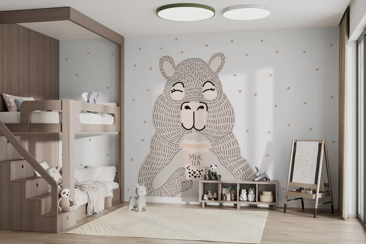 Fototapetak Nagy aranyos bézs színű vízidisznó buborékos teával, minimalista kötőjeles stílusban, fehér pöttyös háttérrel Nr. w01122
