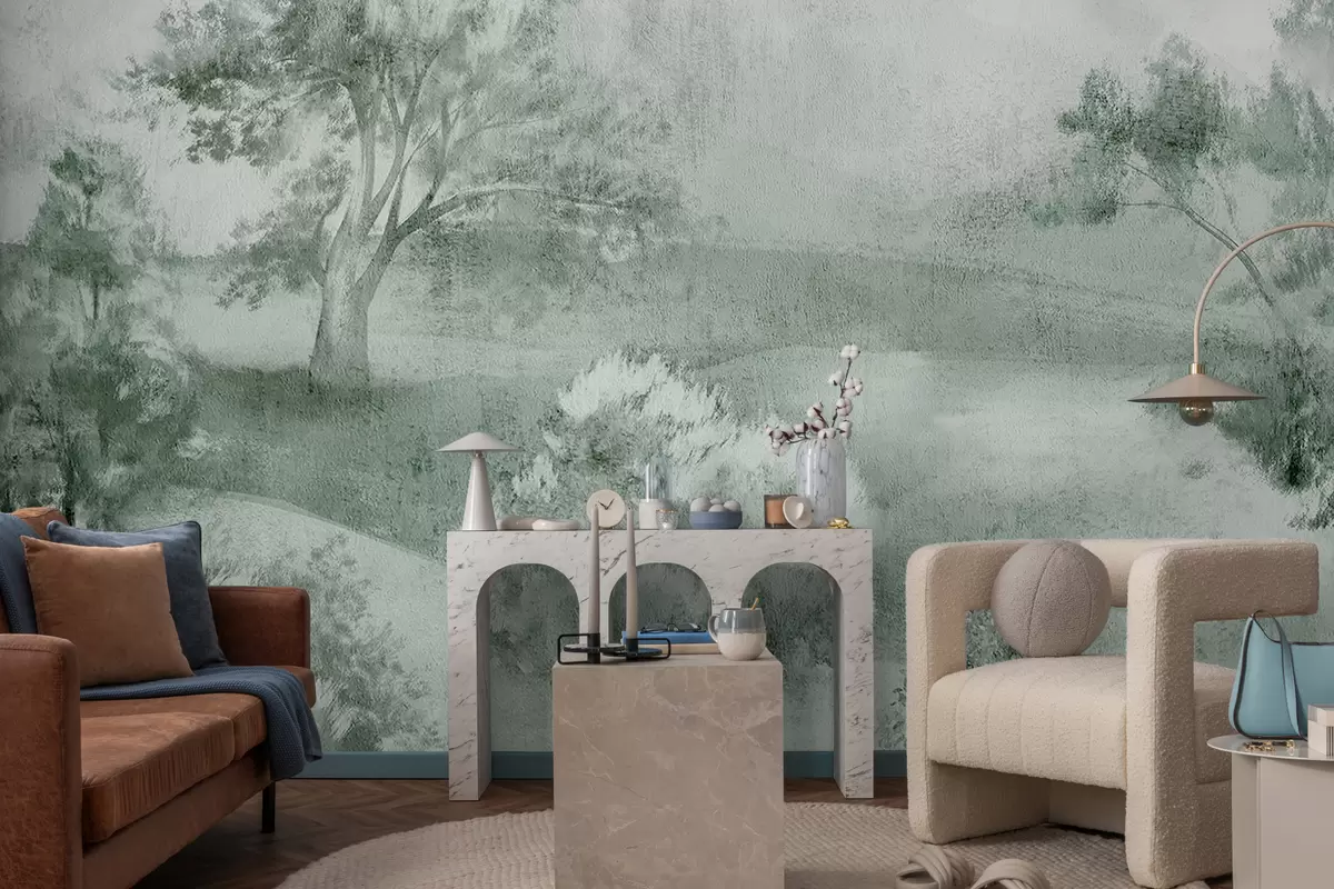 Fototapetak Tájkép egy ködös vidéki jelenetről, buja fákkal és kék árnyalatú lombokkal körülvéve Nr. w01247v2