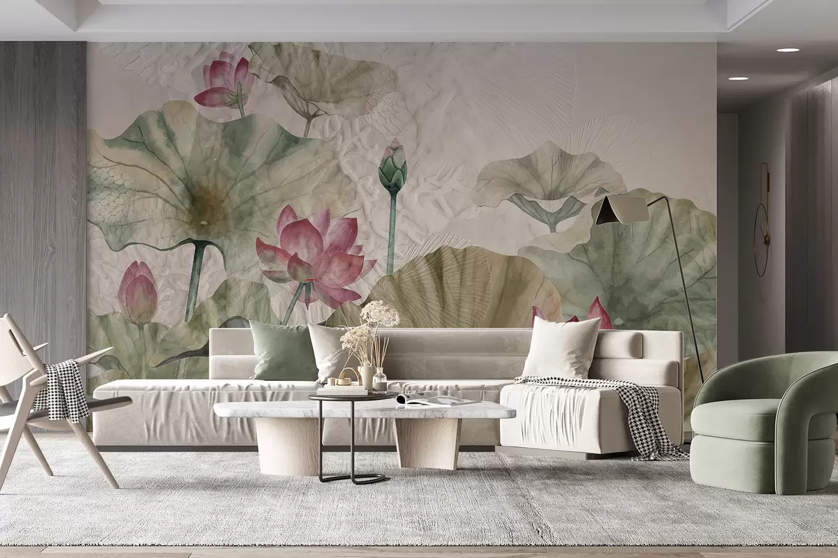 Fototapetak Rózsaszín lótuszvirág zöld levelekkel, világos textúrájú háttérrel Nr. w01248