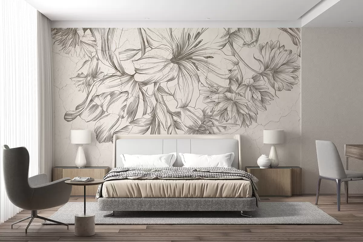 Fototapetak Egy fekete-fehér vázlat, amely nagy virágokat ábrázol, grafikai nyomattal Nr. w01253