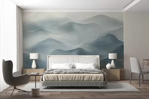 Fototapetak Hegyi táj dombos dombokkal és köddel, amely nyugodt és hangulatos jelenetet teremt Nr. w01254