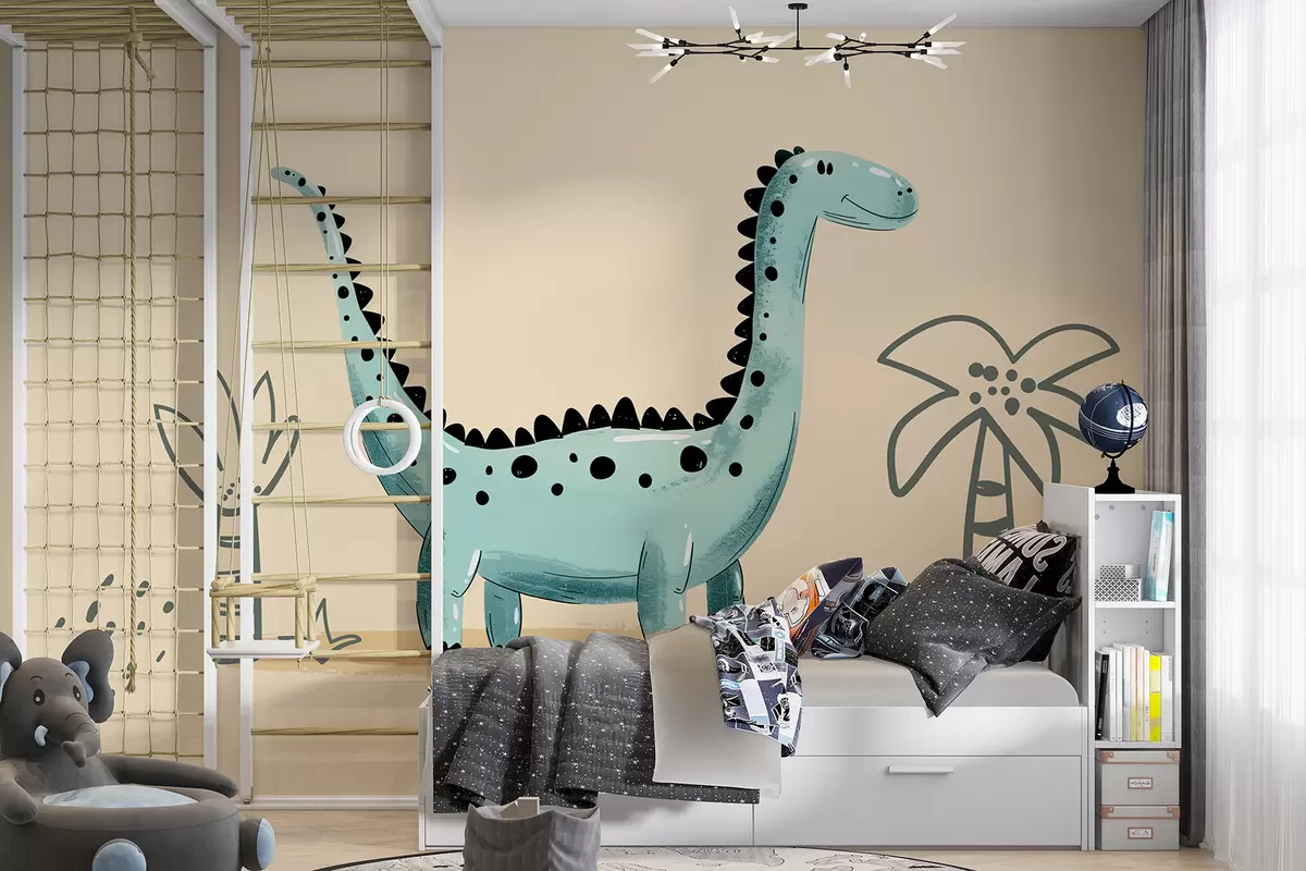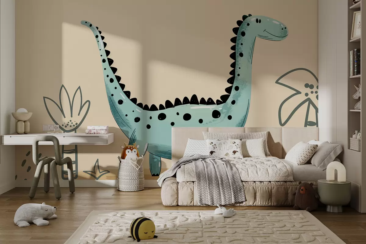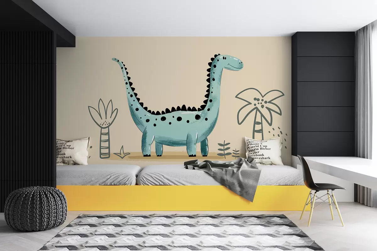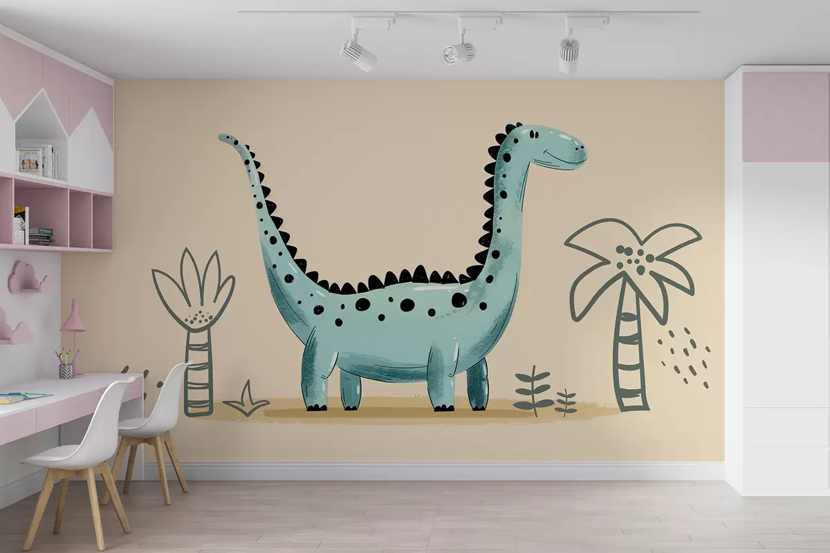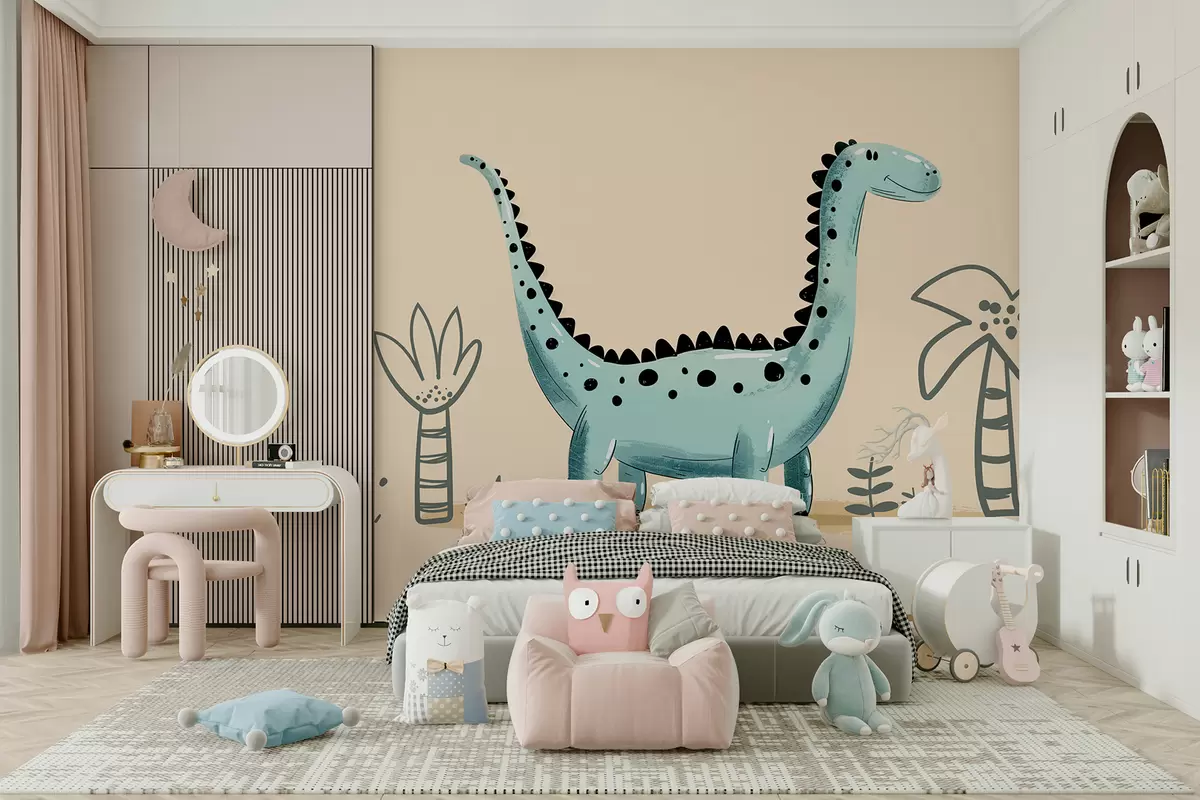 Fototapetak Aranyos dinoszaurusz pálmafákkal, bézs háttérrel Nr. w01357v1