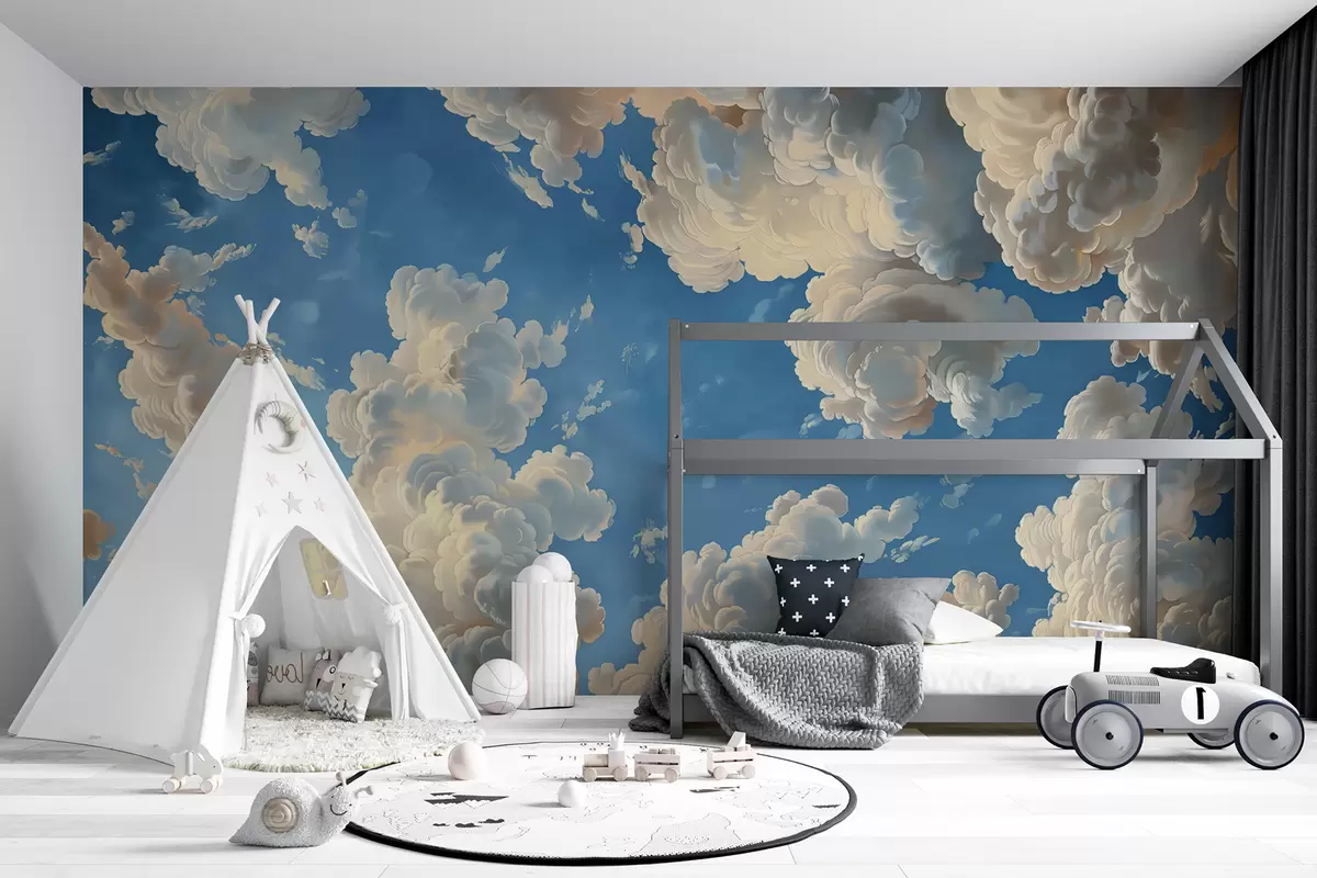 Fototapetak Gomolygó felhők a krém, a lágy barack és a halvány meleg tónusaiban, mély, élénk kék égbolt előtt Nr. w01583