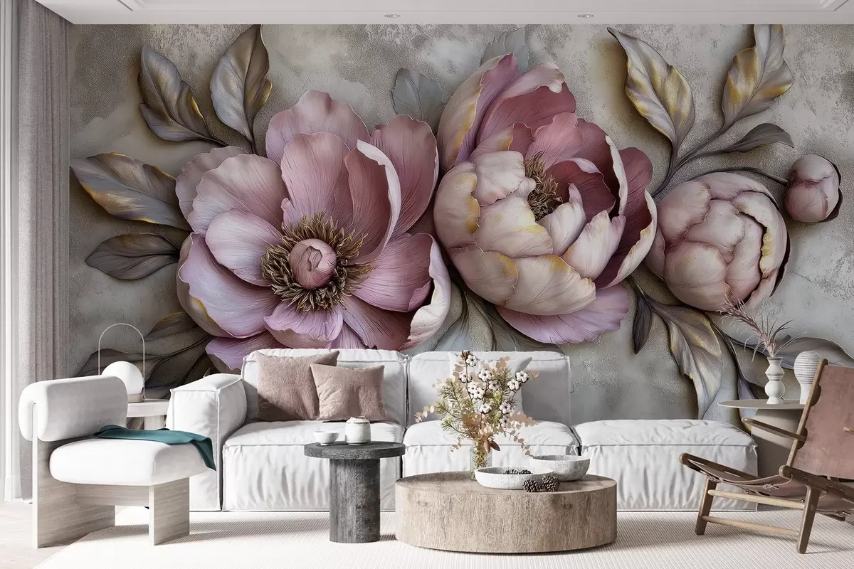Fototapetak Virágos lila bazsarózsa levelekkel és szirmokkal, tompa pasztell színekben, vintage stílusban Nr. w01825
