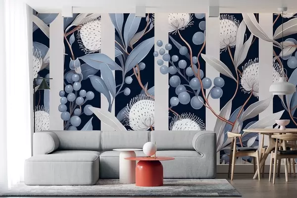 Fototapetak Virágok dísze vadon termő bogyókkal, vintage, kék és szürke színekben Nr. w01886