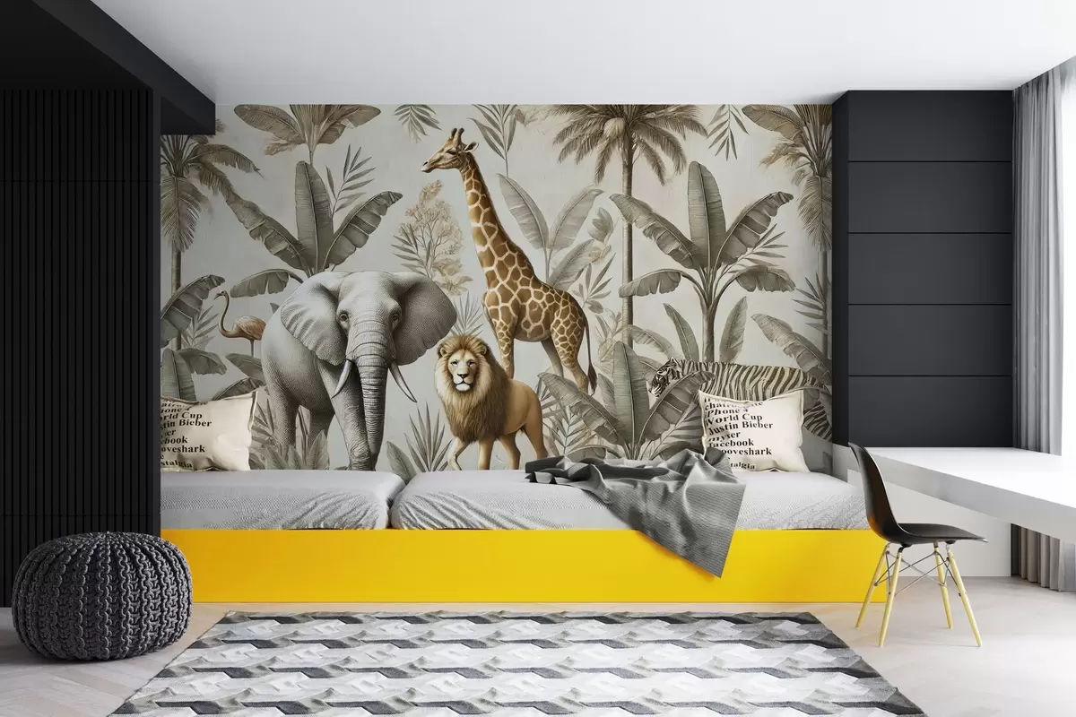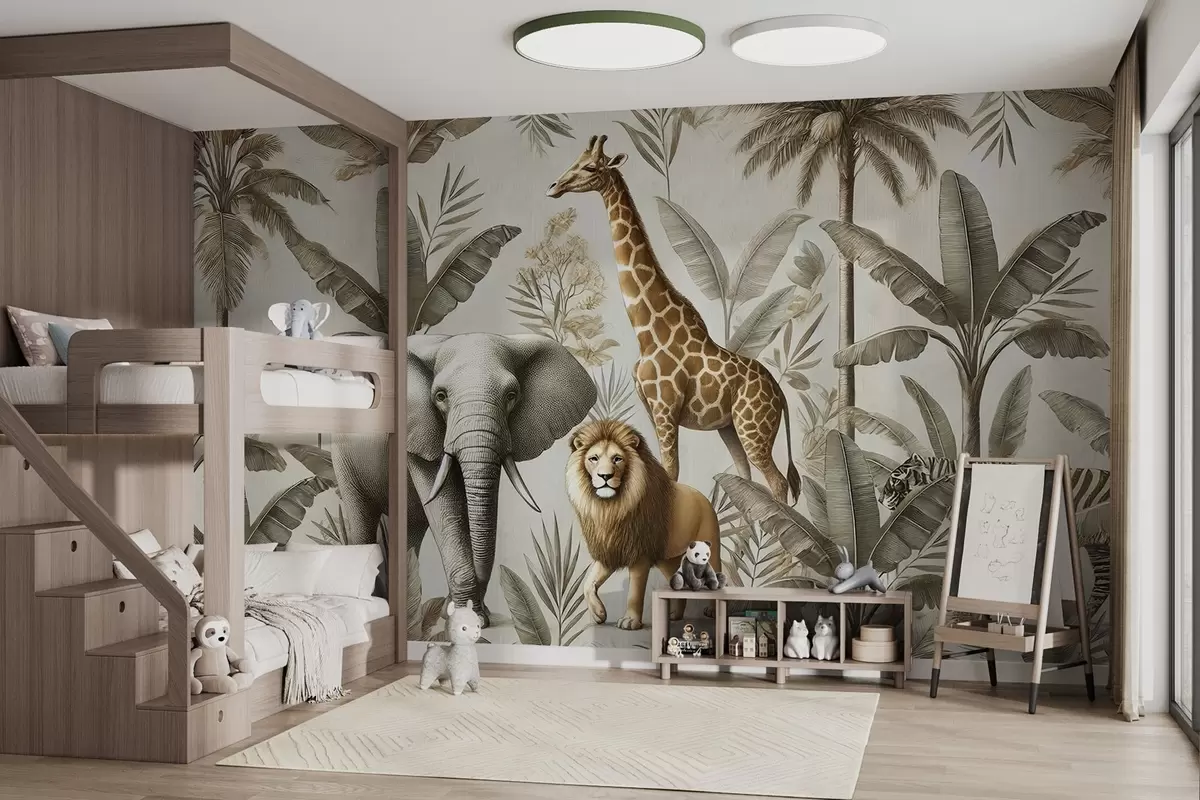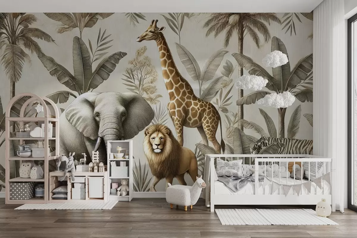 Fototapetak Safari gyermek tapéta trópusi tájjal és különböző állatokkal elegáns színekkel Nr. w01956