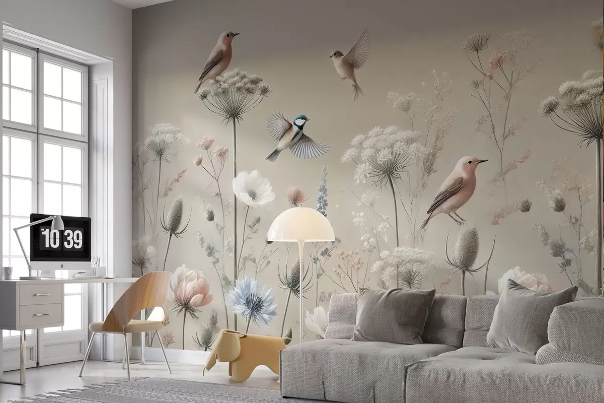 Fototapetak Finom vadvirágok madarakkal bézs háttéren Nr. w01958