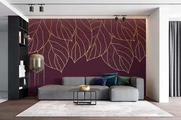 Fototapetak Minimalista tapéta nagy sárga levelek sziluettjei, erek sötét boros háttérrel Nr. w01960v4