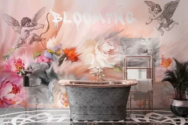 Fototapetak Virágzó virágok, bazsarózsák, kis Cupids nyilakkal, akril művészet Nr. w02023