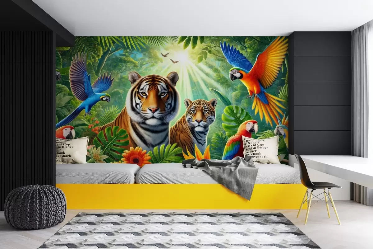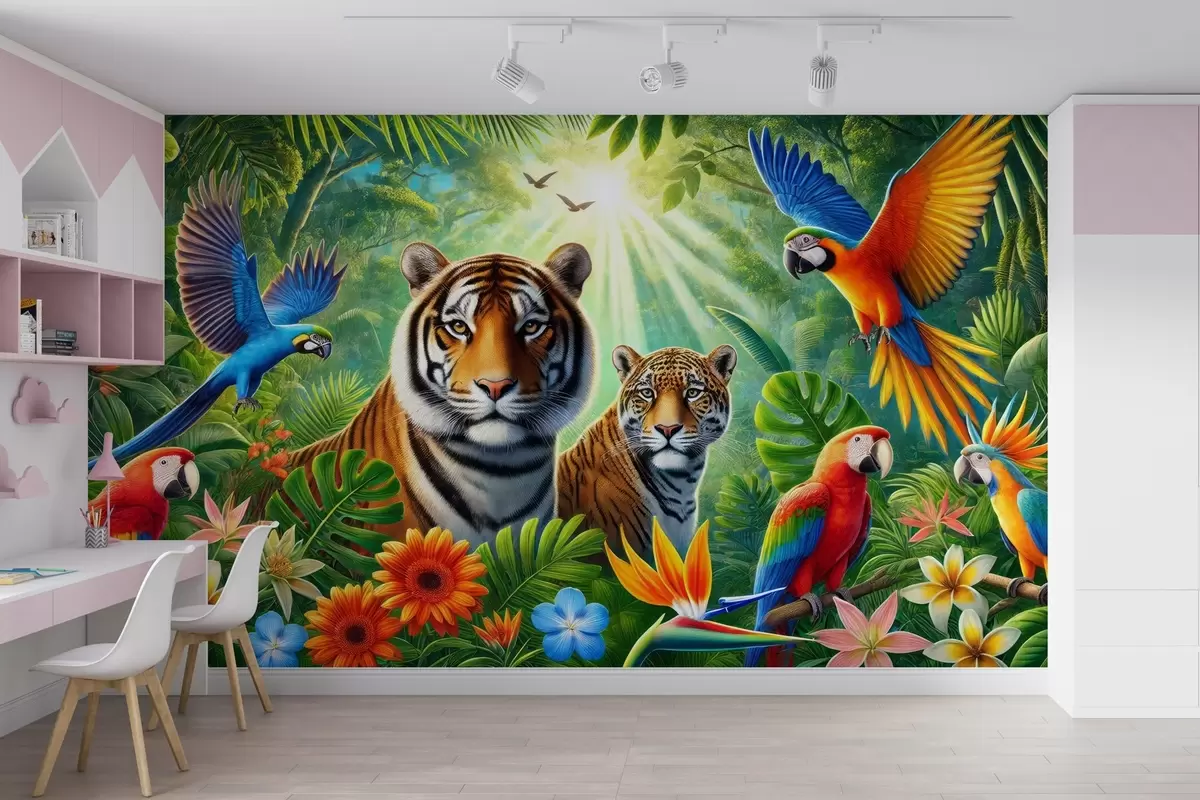 Fototapetak Színes falfestmény a trópusok panorámájával, egy pár tigrissel, papagájokkal és virágokkal Nr. w02083