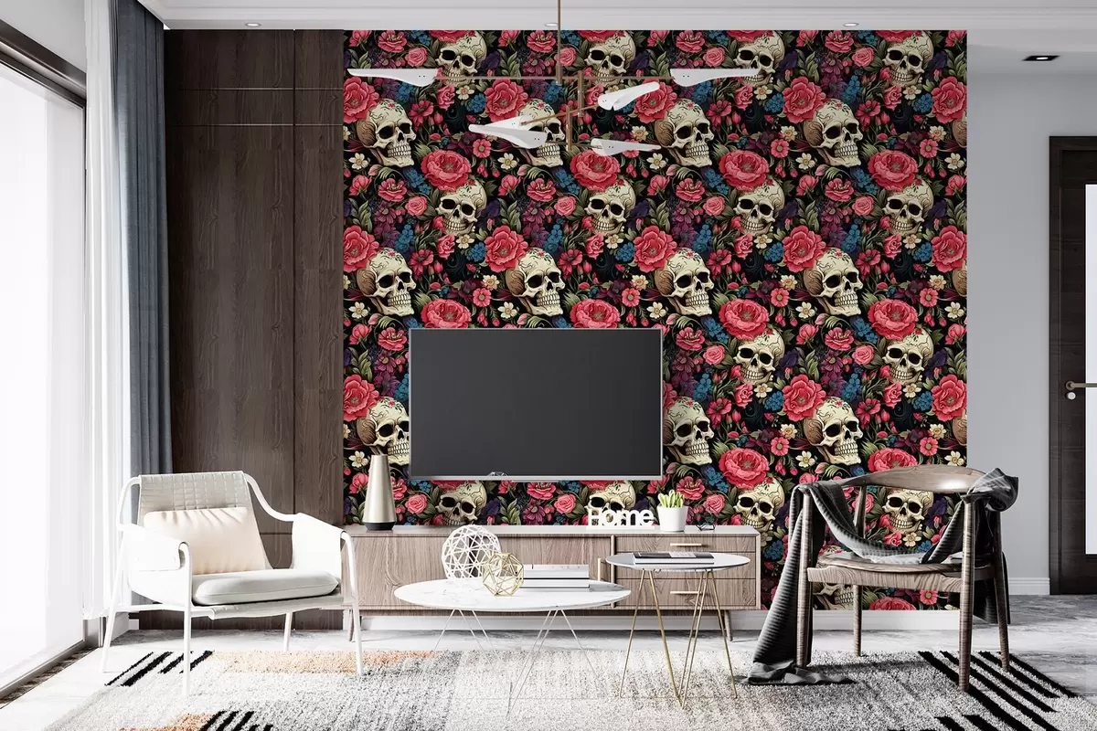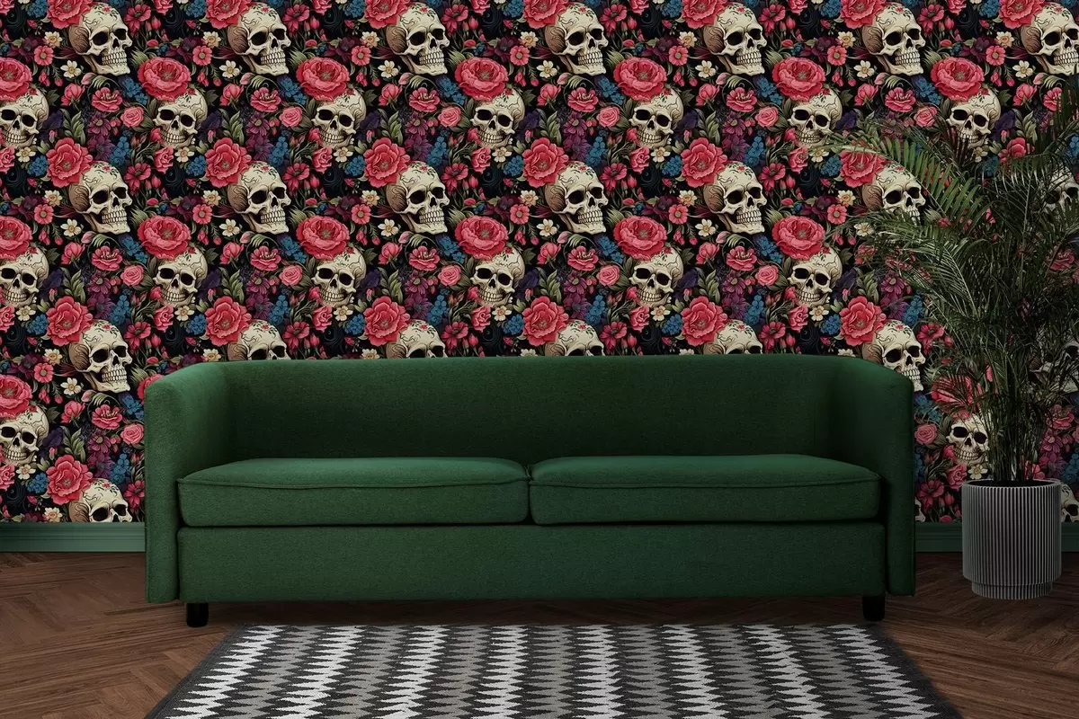 Fototapetak Misztikus retro stílusú tapéta koponya mintával és virágokkal rózsaszín tónusokban sötét háttéren Nr. w02084