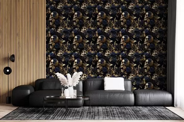 Fototapetak Luxus stílusú tapéta sárga fém koponyák és sötét virágok mintájával Nr. w02085