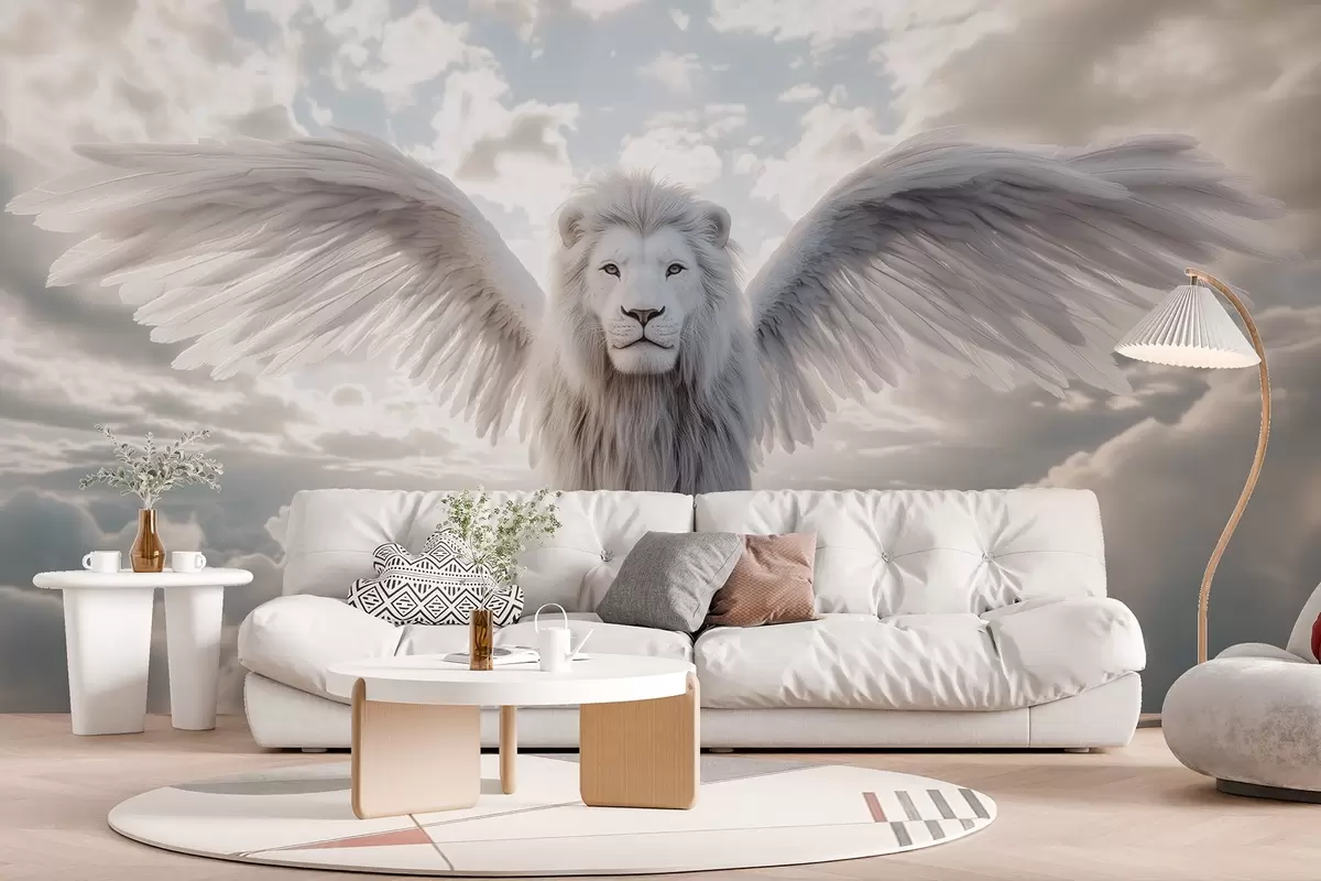 Fototapetak Fenséges fehér oroszlán, gyönyörű, dús fehér sörénnyel és szárnyakkal a szürke égbolt ellenében Nr. w02144v1