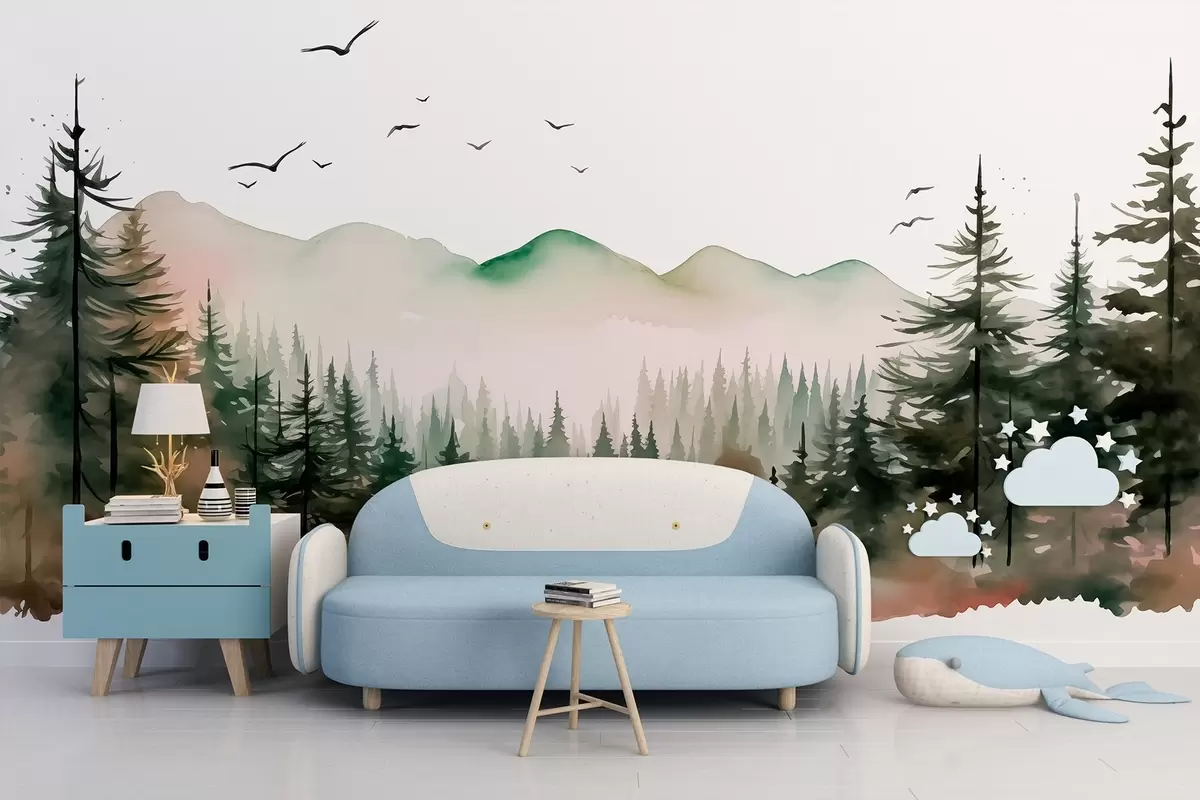 Fototapetak Akvarell erdei és hegyi tájak, zöld és rózsaszín színekben Nr. w02150v1