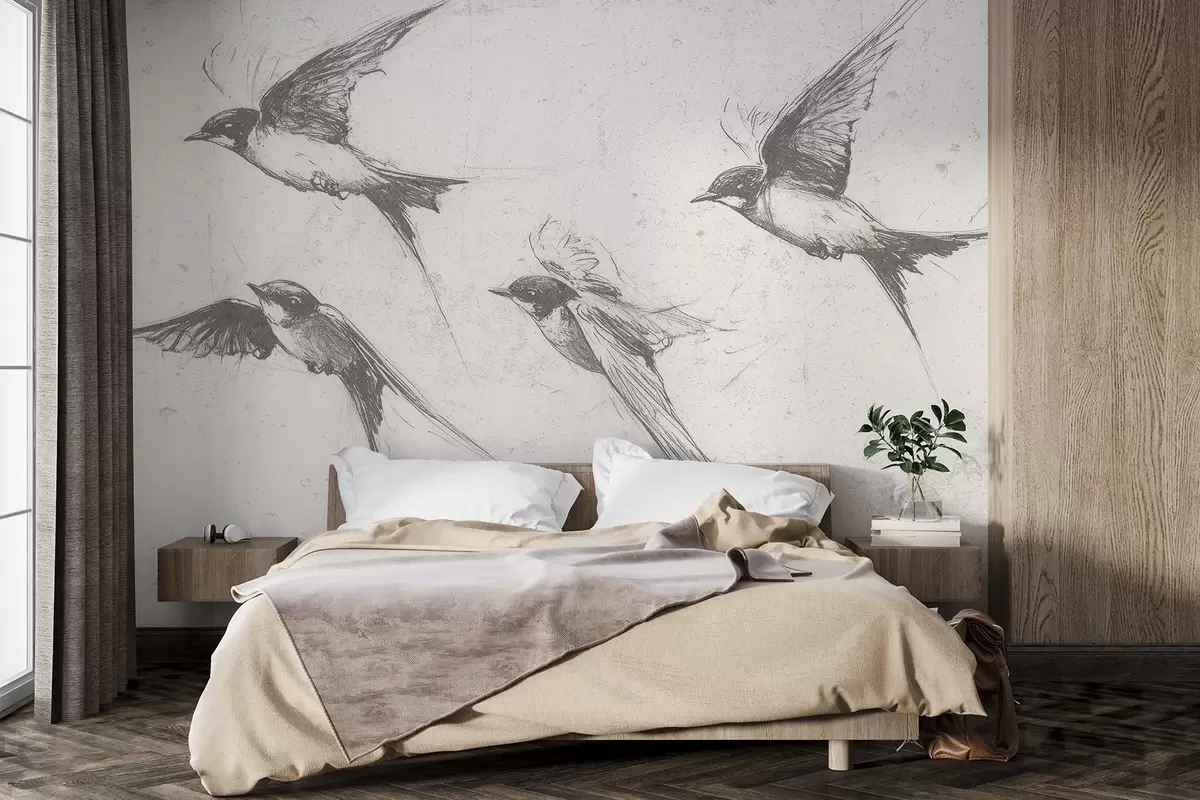 Fototapetak Repülő madarak, tusrajz, minimalizmus, szürke színek, szürkék Nr. w02155