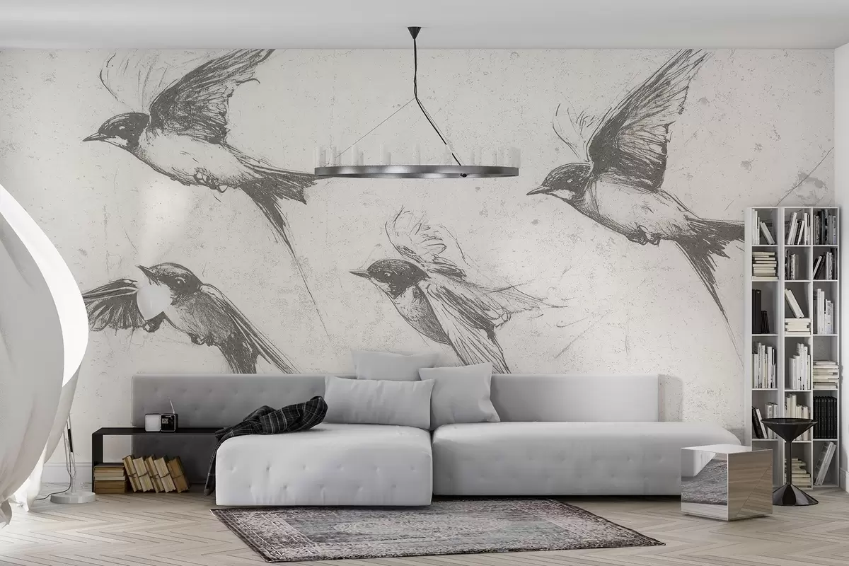 Fototapetak Repülő madarak, tusrajz, minimalizmus, szürke színek, szürkék Nr. w02155
