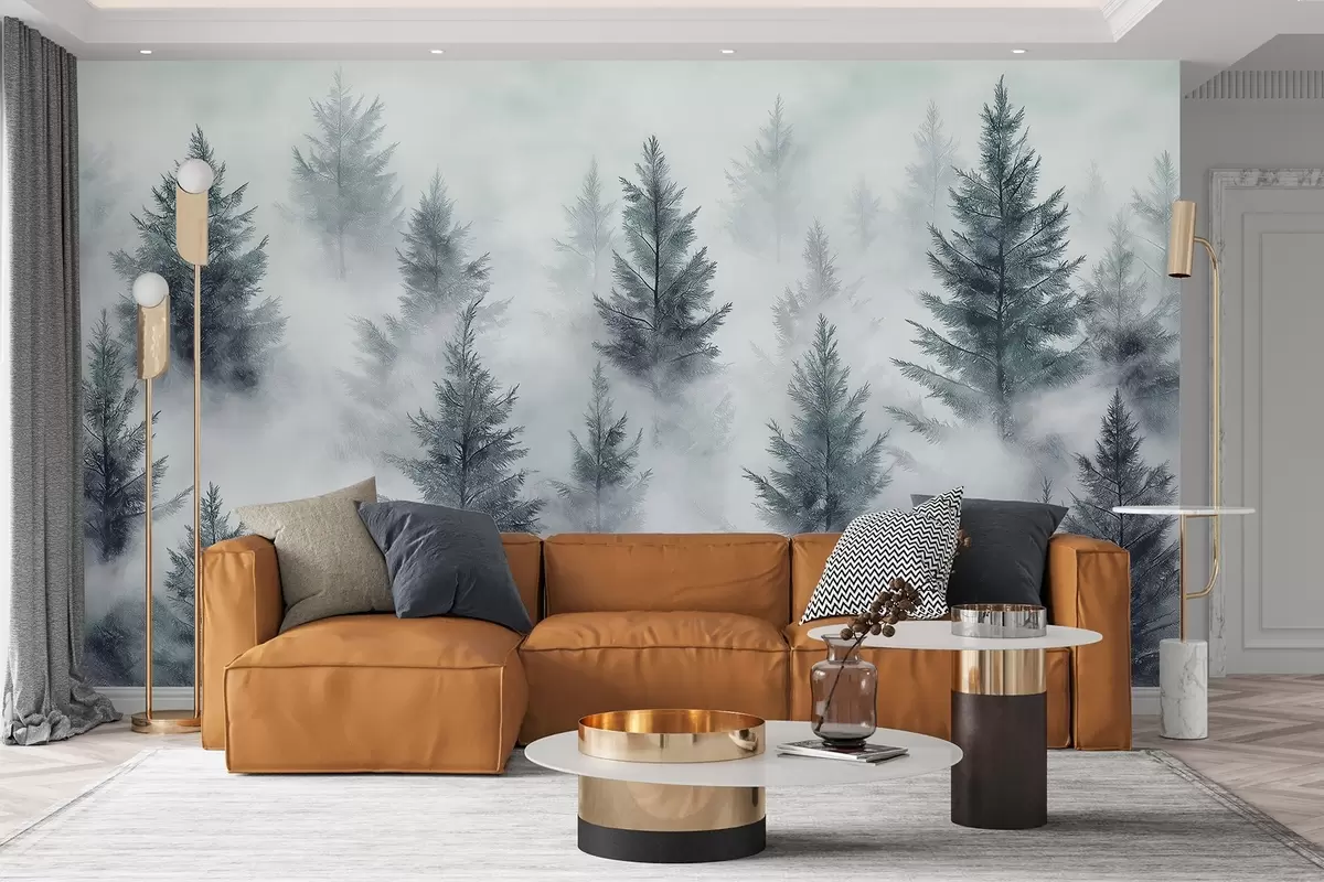 Fototapetak Gyönyörű erdő fenyőfákkal, köd, természet tájak, szürke színek Nr. w02222v2