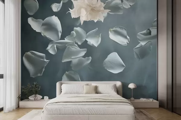 Fototapetak Finom rózsaszirmok esnek lefelé egy sötét háttéren Nr. w02289