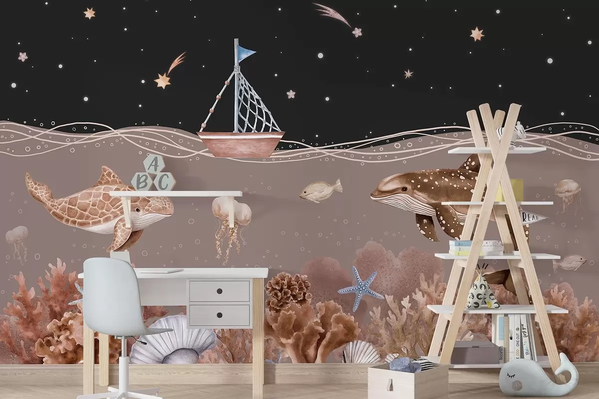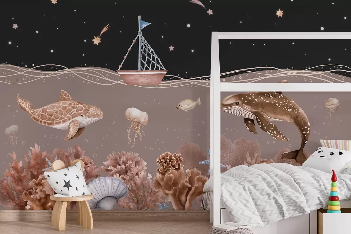 Fototapetak Tengeri élet, akvarell stílus, korallok, hajó, delfin, medúza, csillagos égbolt, bézs színek Nr. w02310v1