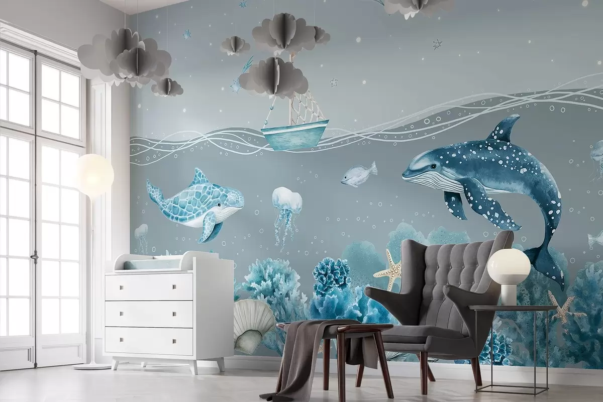Fototapetak Tengeri élet, akvarell stílus, korallok, hajó, delfin, medúza, csillagos égbolt, lágy kék színek Nr. w02310v3