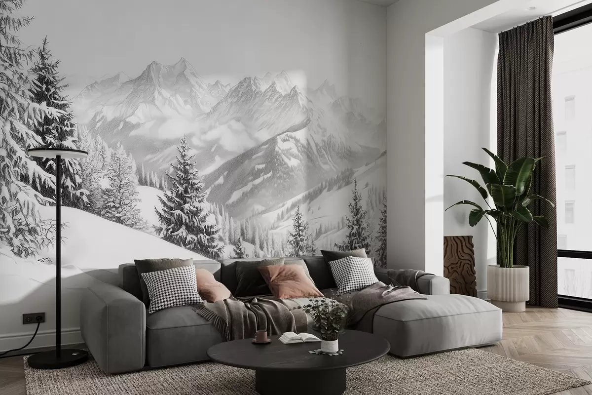 Fototapetak Tél a hegyekben, erdő, Alpok, ceruza stílusú rajz, természet tájak Nr. w02353