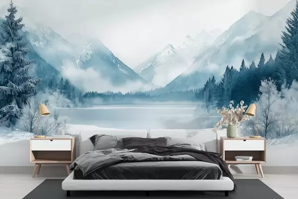 Fototapetak Téli hegyek, befagyott tó, fenyőerdő, kék színpaletta, akvarell stílusban Nr. w02354