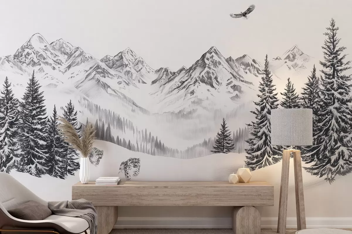 Fototapetak Téli hegyek, hóleopárdok, fenyőerdő, ceruzarajz, repülő sas Nr. w02360