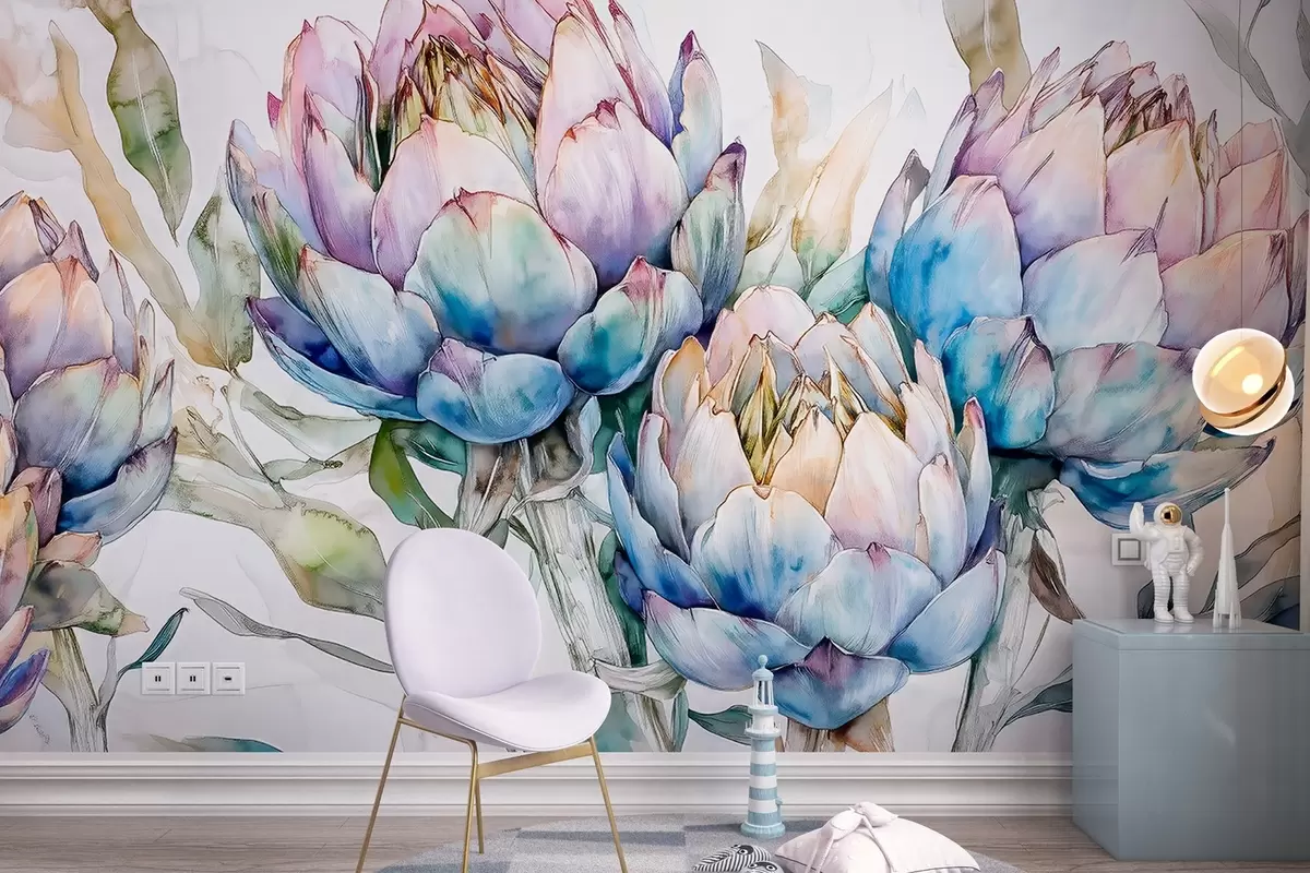 Fototapetak Articsóka rajz, akvarell stílusban, virágos, lila, bézs, zöld Nr. w02484