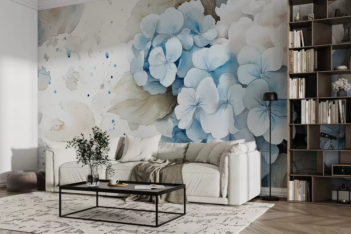 Fototapetak Akvarell stílusú rajz hortenzia virágok levelekkel, lágy természetes színekkel Nr. w02493