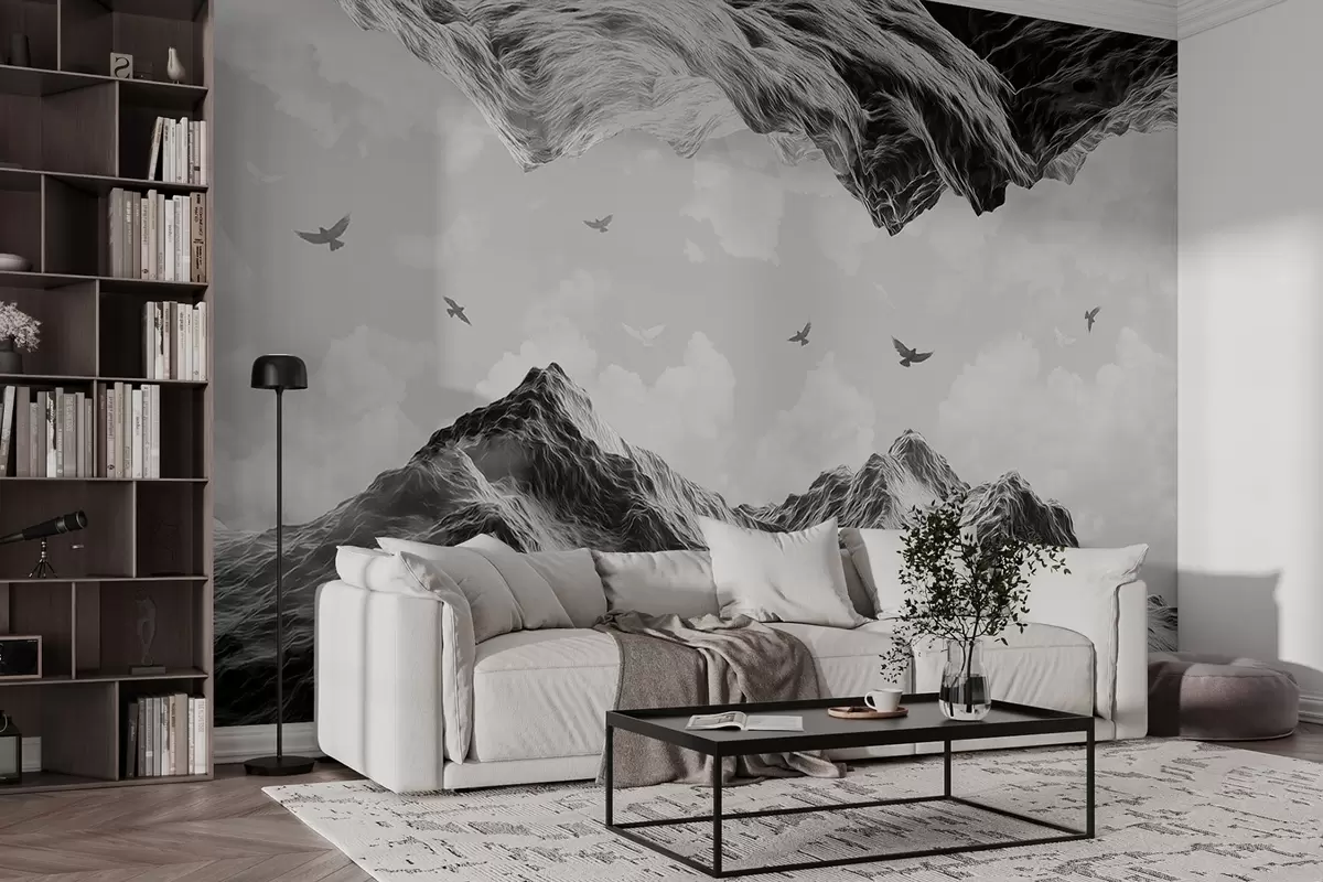 Fototapetak Hegyek táj, realizmus, repülő madarak, természet, felhők, fekete-fehér színek Nr. w02514