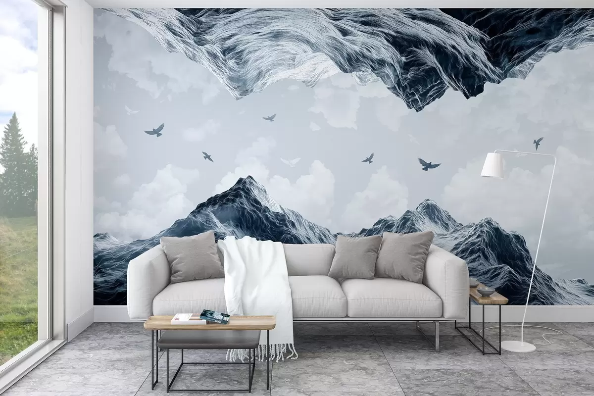 Fototapetak Hegyek táj, realizmus, repülő madarak, természet, felhők, kék színek Nr. w02514v1