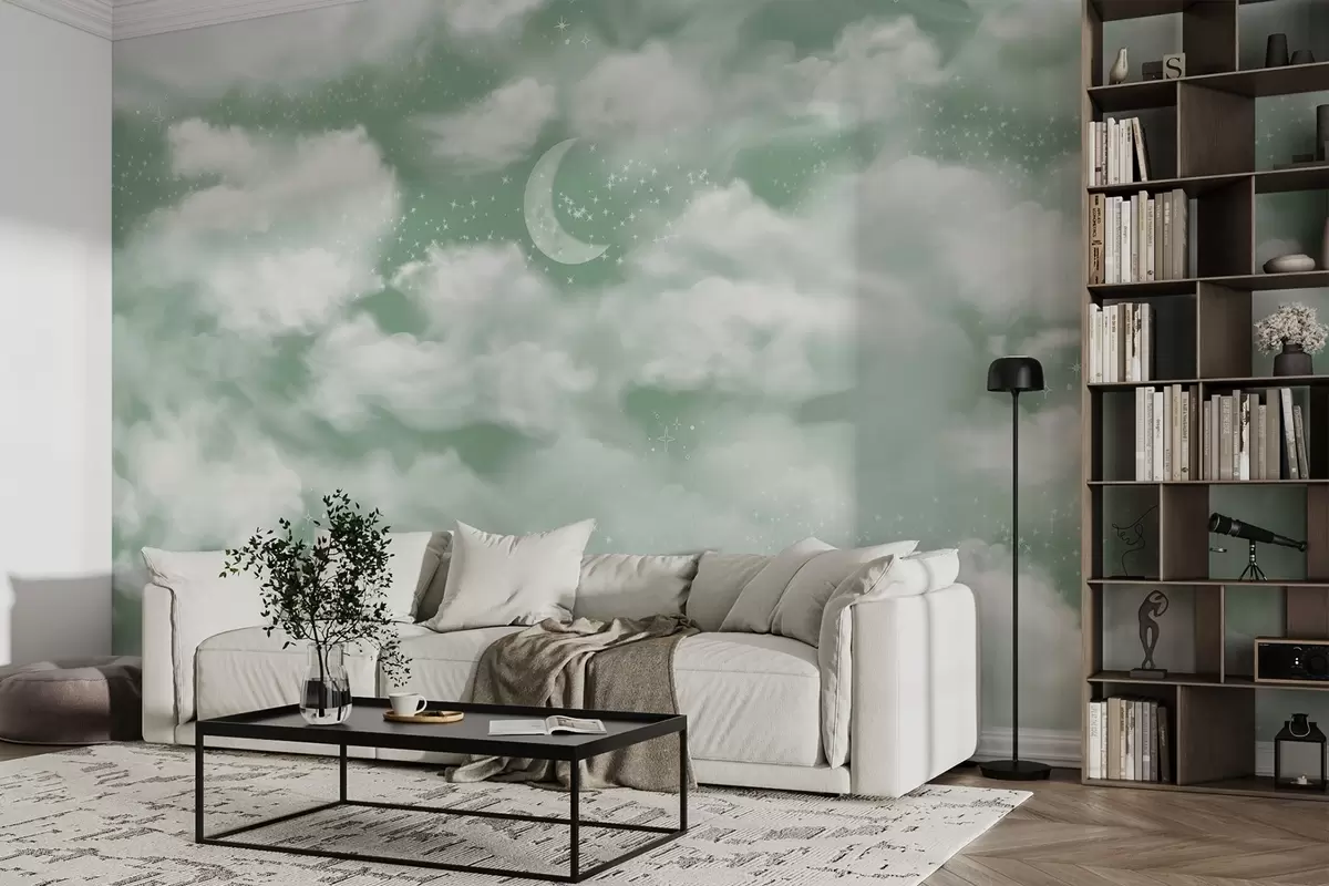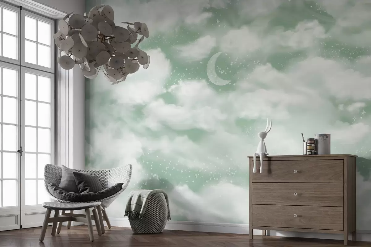 Fototapetak Csillagos égbolt holddal és felhőkkel, álmodozó, éteri, lágy zöld színekkel Nr. w02515v2