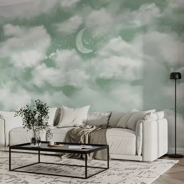 Fototapetak Csillagos égbolt holddal és felhőkkel, álmodozó, éteri, lágy zöld színekkel Nr. w02515v2