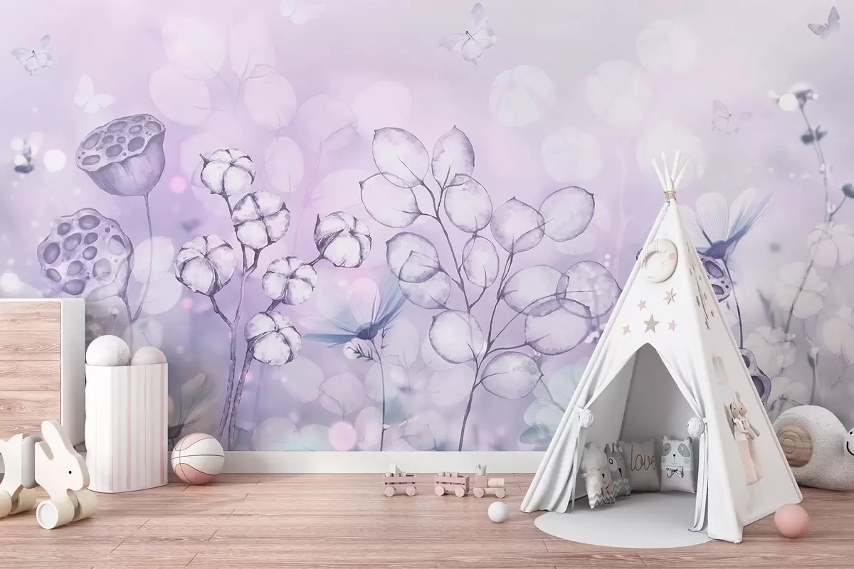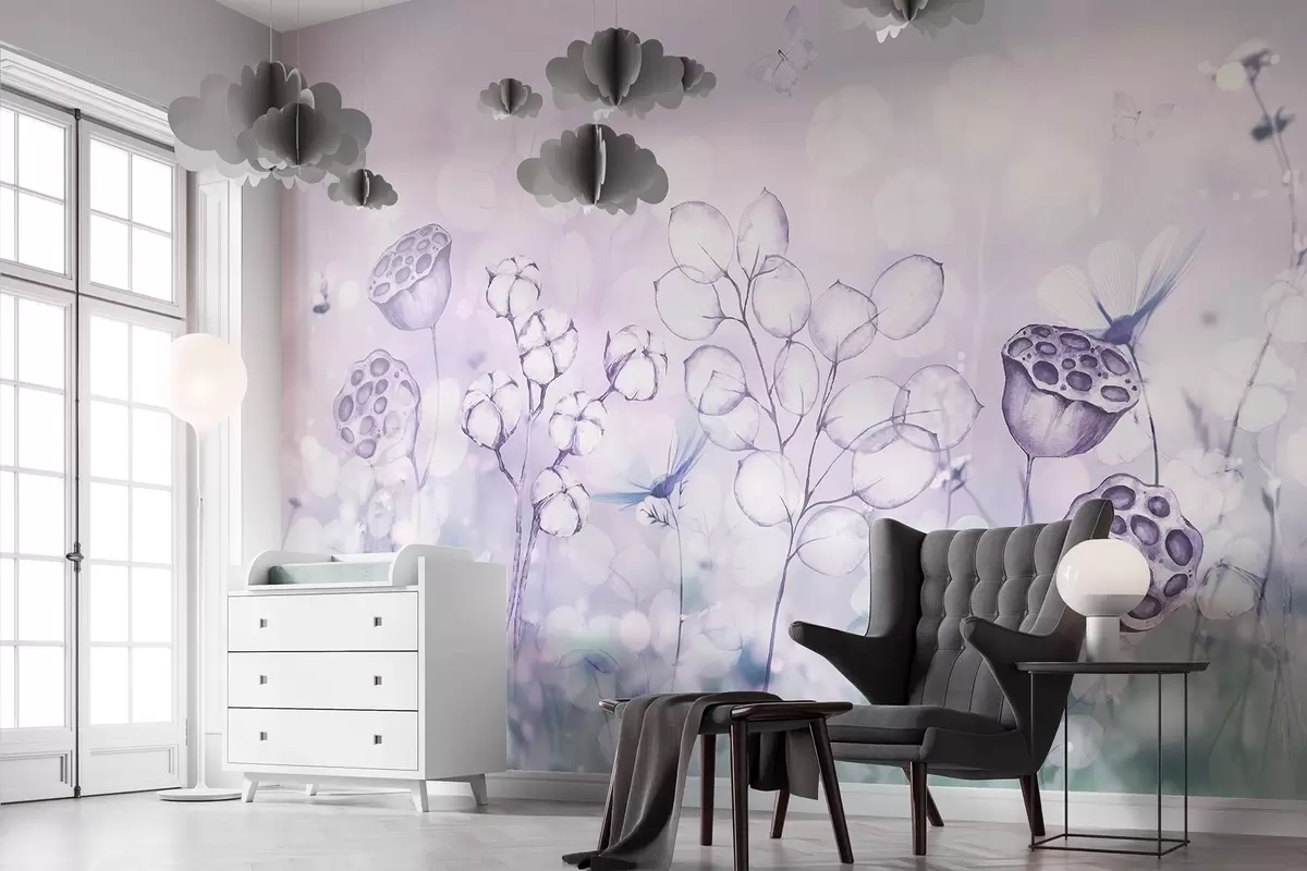 Fototapetak Álomszép virágoskert, pillangó, pamutvirágok, lótuszok, lila színek Nr. w02516v1