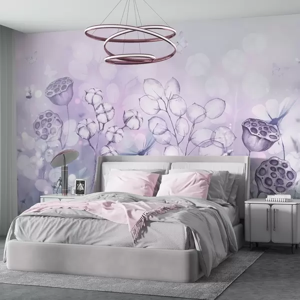 Fototapetak Álomszép virágoskert, pillangó, pamutvirágok, lótuszok, lila színek Nr. w02516v1