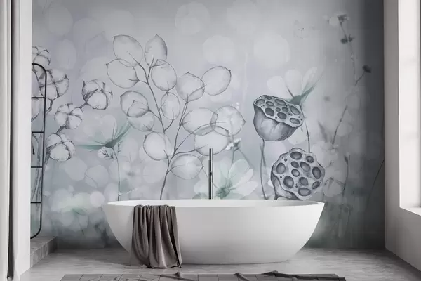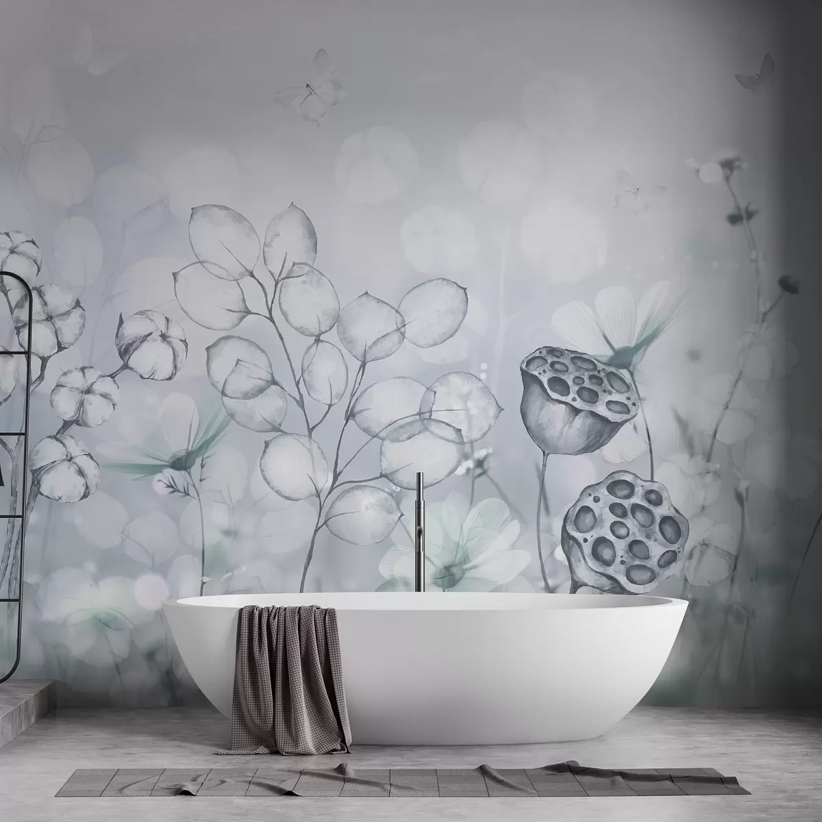 Fototapetak Álomszép virágoskert, pillangó, pamut virágok, lótuszok, szürke színek Nr. w02516v2