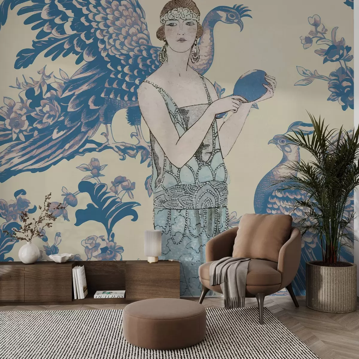 Fototapetak Elegáns vintage virágos minta egy nővel kék és rózsaszín árnyalatokban Nr. w02532