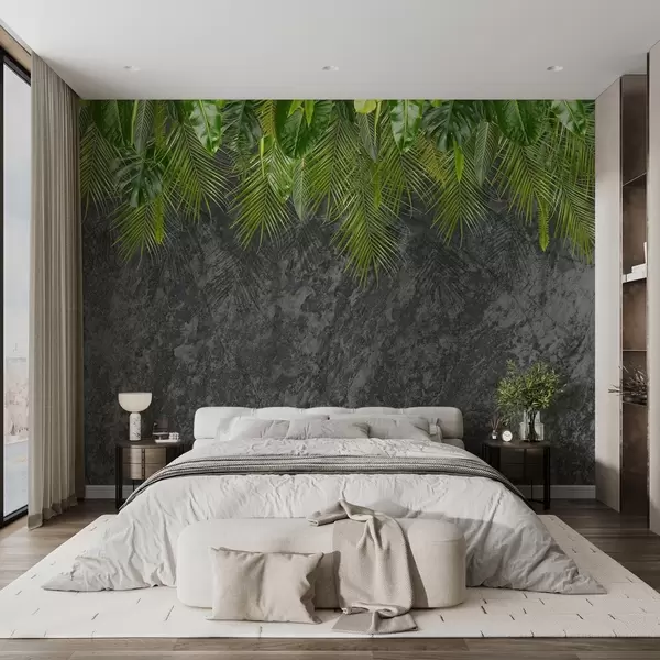 Fototapetak trópusi levelek a kőutánzat hátterén Nr. w02547