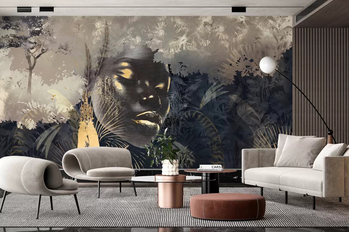 Fototapetak Varázslatos Afrika esőerdővel, lányos és vektoros elemek kék árnyalattal Nr. w02642v1