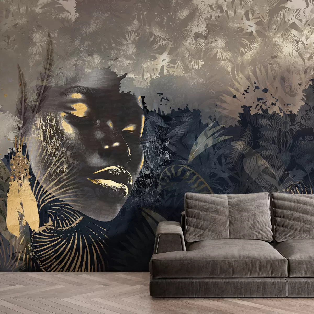 Fototapetak Varázslatos Afrika esőerdővel, lányos és vektoros elemek kék árnyalattal Nr. w02642v1