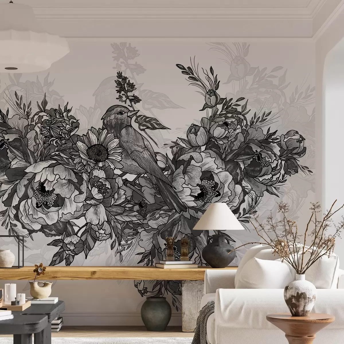 Fototapetak Monokróm virágos és madár kompozíció Nr. w02834