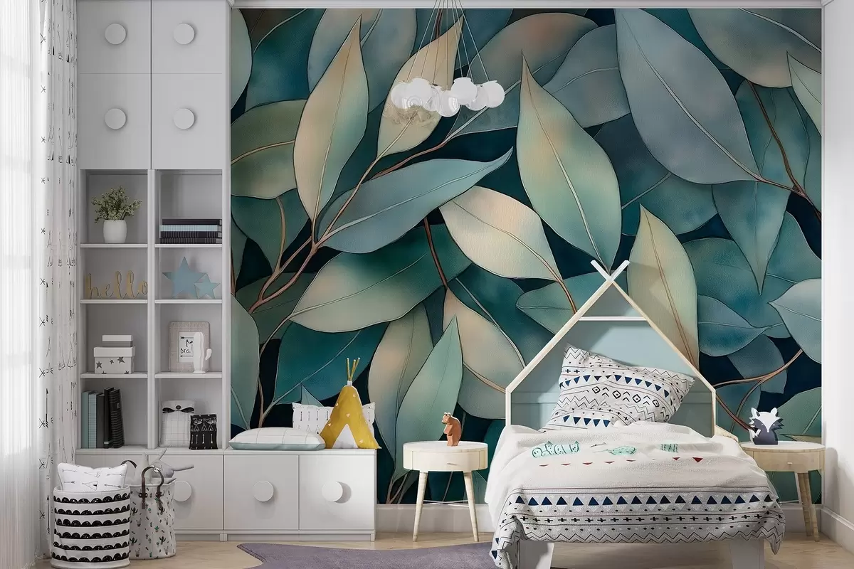 Fototapetak Eukaliptusz levelek, akvarell stílusú rajz, virágos minta, zöld színek Nr. w02931