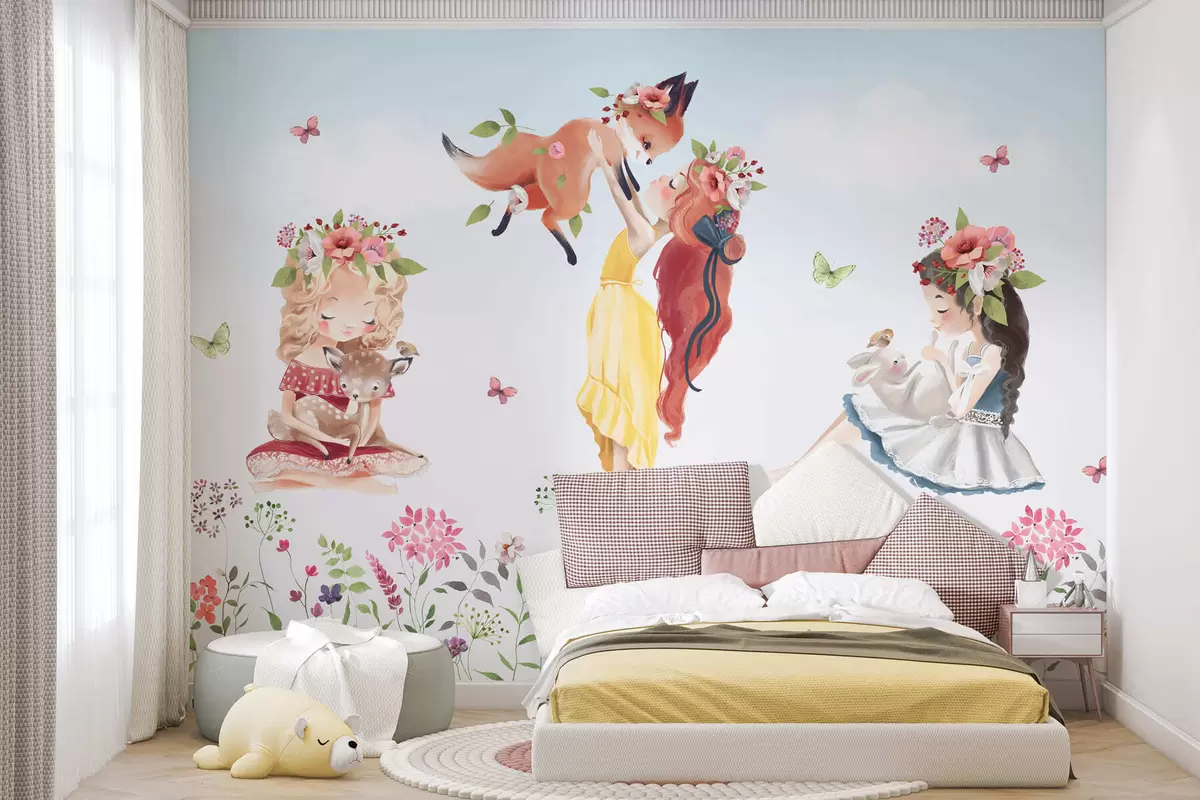 Fototapetak Lányok aranyos erdei állatokkal Nr. w03002