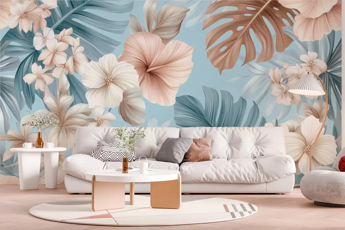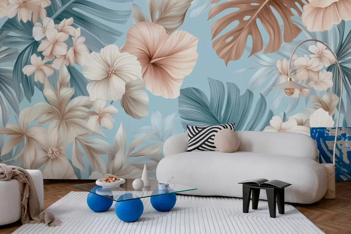 Fototapetak trópusi nyomtatás nagy levelekkel és virágokkal pasztellkék és bézs színekben Nr. w03013