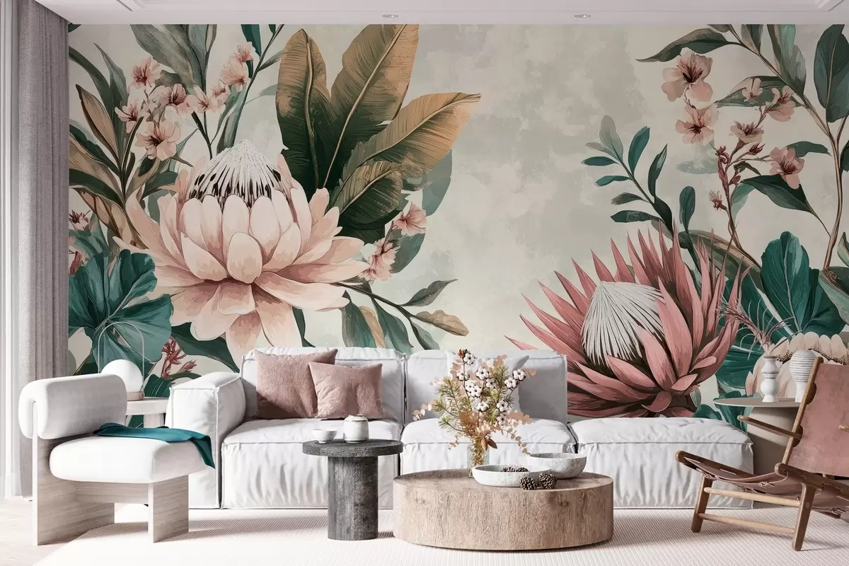 Fototapetak egzotikus növények, pálmalevelek és protea virágok ihlette vintage Nr. w03015