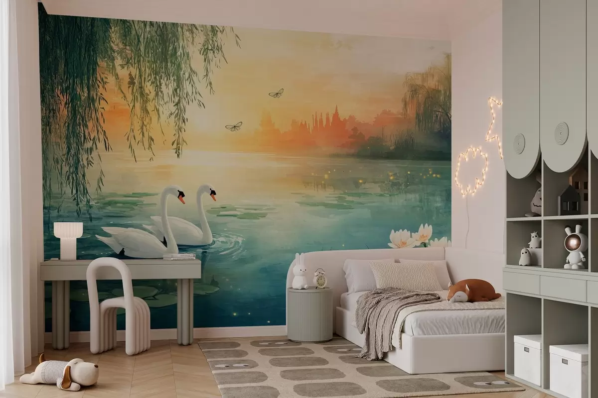 Fototapetak Romantikus tájkép olajfestmény stílusában két fehér hattyúval a tavon Nr. w03017
