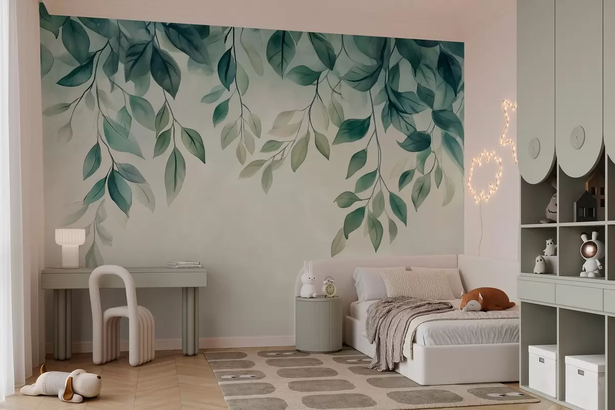 Fototapetak zöld akvarell stílusú levelek lógnak a tetejéről Nr. w03024