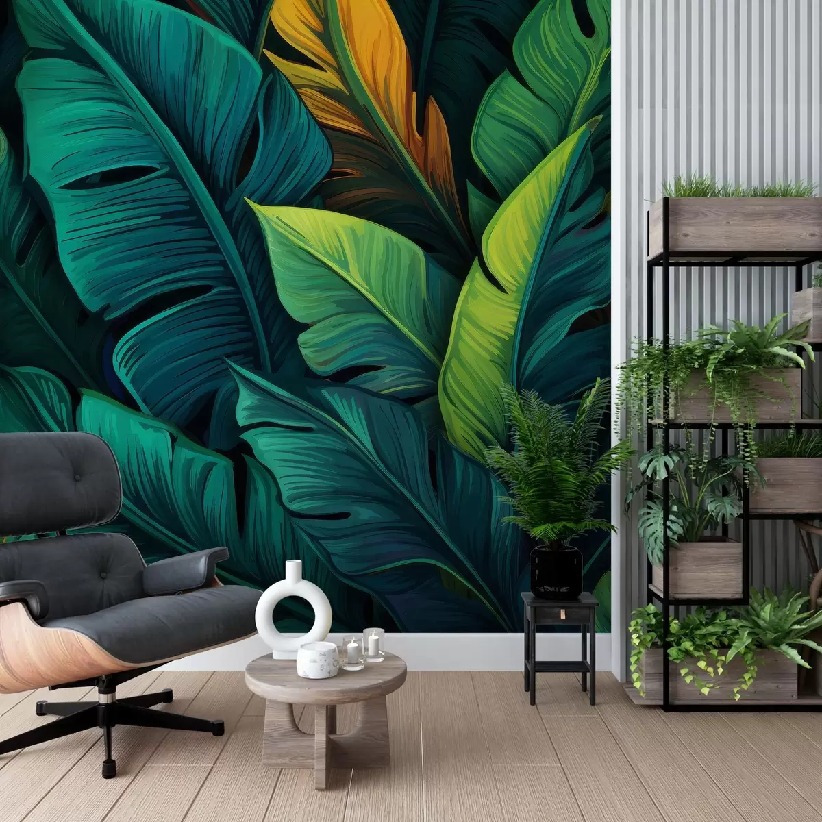 Fototapetak Élénk trópusi levelek mélyzöld, kékes és narancssárga árnyalatokkal Nr. w03078