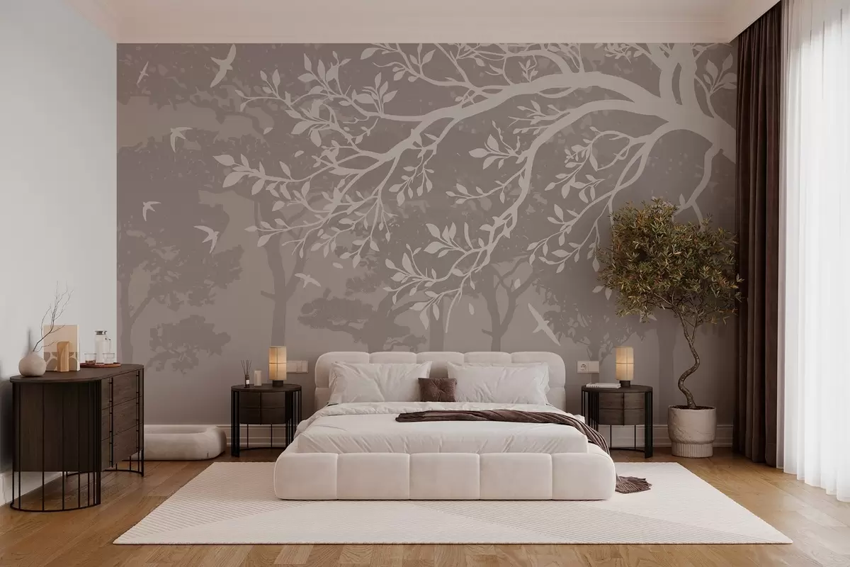 Fototapetak sziluettje egy krémes fa ága madarakkal, a háttérben az erdőben Nr. w03116